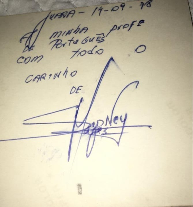 Ele presenteou sua Professora de Português, Ingeborg Schirac Crispim com uma fotografia. No verso dessa foto, escreveu uma pequena dedicatória, fruto do carinho e do respeito que sentia pela professora. Para muitos, poderia parecer apenas um gesto de adolescente, mas para a professora, aquela ação certamente representava reconhecimento, afeto e a lembrança de que seu trabalho tocava vidas.